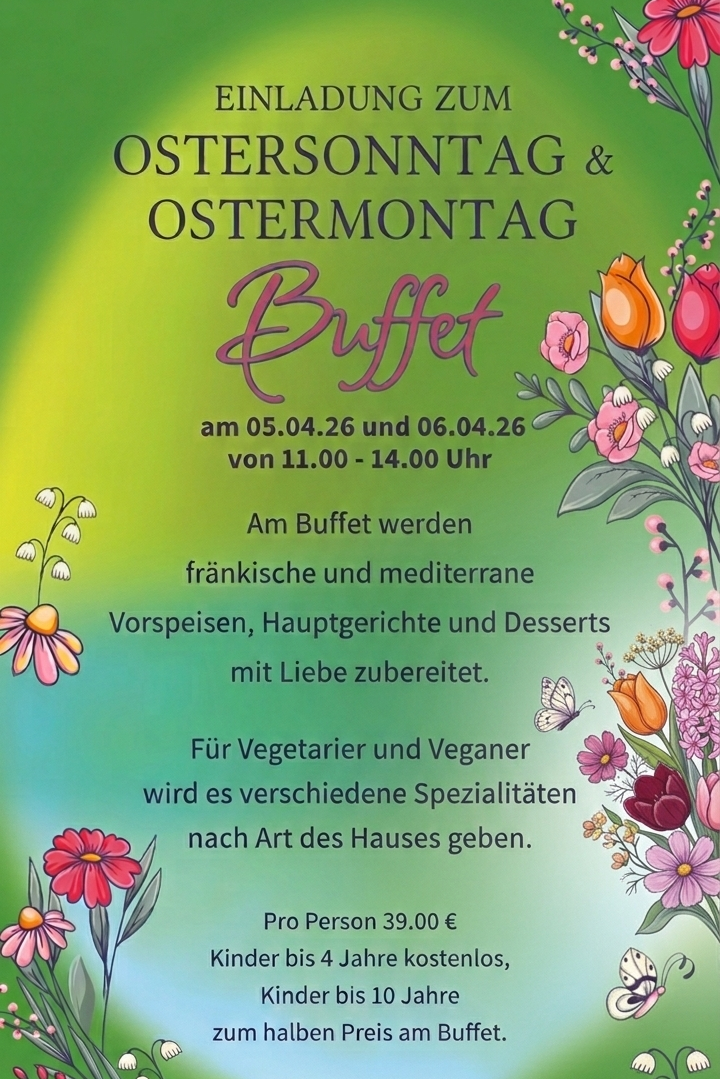 Lassen Sie an den Feiertagen die Küche kalt und genießen Sie die Zeit mit Ihren Liebsten bei uns. Wir verwöhnen Sie mit einer liebevollen Auswahl an fränkischen Klassikern und mediterranen Spezialitäten.